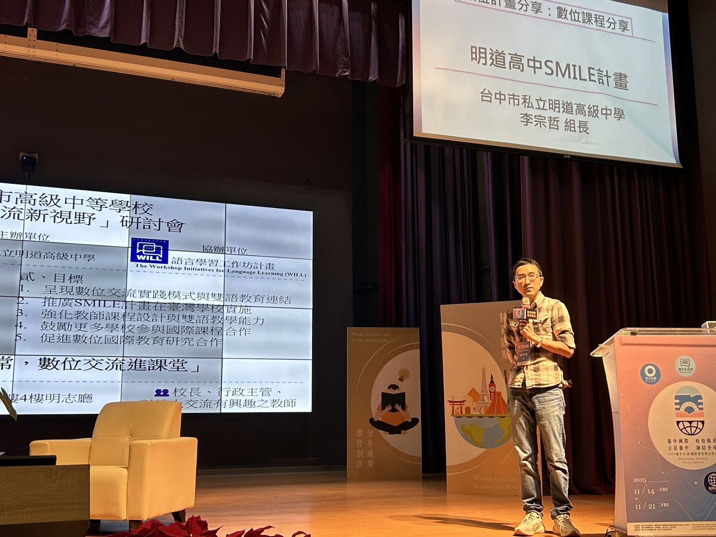 At the International Education Showcase hosted by the Taichung International Education Center, Mingdao High School presented its achievements from three years of participation in the SMILE Project. As Taiwan’s key partner promoting the SMILE Project, Mingdao highlighted English as a lingua franca and its role in creating authentic language-use situations for students. Coordinator Lee, Tsung-Che emphasized that Mingdao will continue expanding cross-school collaboration to strengthen meaningful global learning. (Text by Mark)