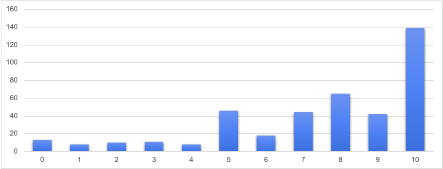 The Net Promotion Score as of the end of 2022 is 0.166 (data collection target: 404 people). The graph below shows the basis for this value, showing the distribution of responses from 10 (willing to recommend) to 0 (not at all) to the question, “Do you recommend this program to your friends and colleagues?”