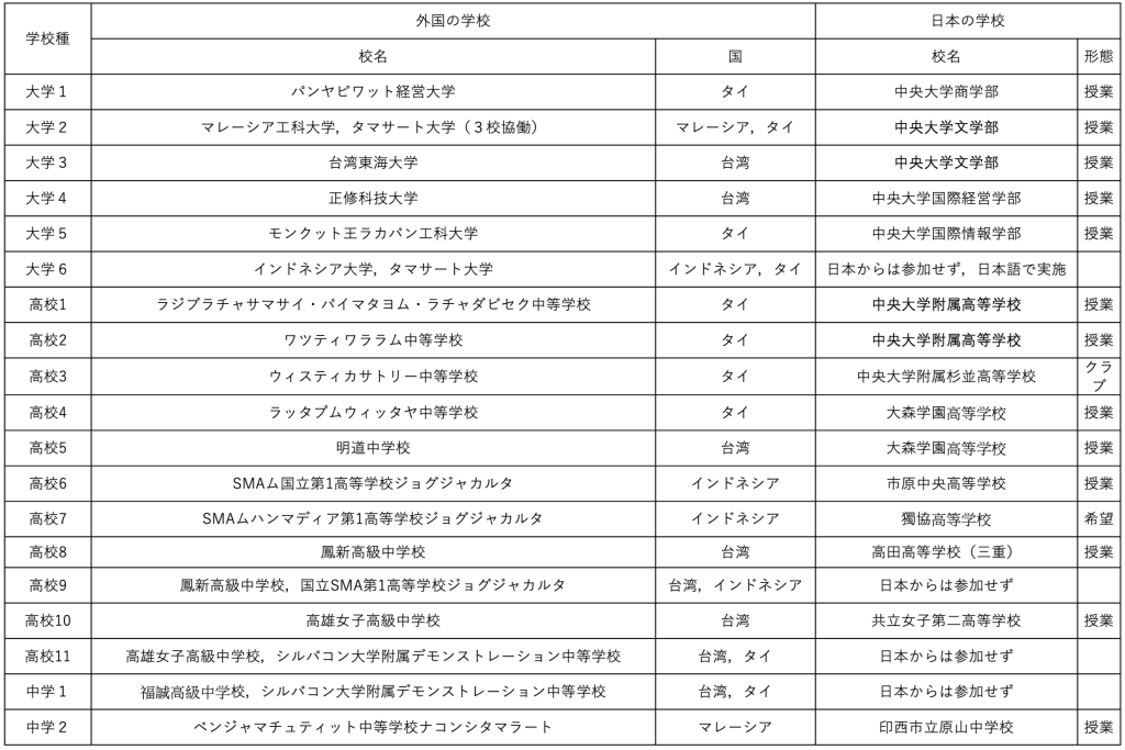 Chuo University, Osaka Kyoiku University, Mie University, Dokkyo High School, Chuo University Suginami High School, Ichihara Chuo High School, Kanagawa Prefectural Tsukuihama High School, Kyoritsu Women’s Second High School, University of Tsukuba Sakado High School, Chuo University Junior High School, Kagoshima Ikuei High School, Tokyo Jogakuin High School, Mie University Junior High School, Kogakuin University Junior High School, Zheng Siu University of Science and Technology, Kaohsiung Municipal Fucheng Senior High School, National Fengxin Senior High School, Kaohsiung Municipal Kaohsiung Girls’ Senior High School School, Xinmin Senior High School, Thammasat University, King Mongkut’s Institute of Technology Ladkrabang, Wistikkasatri Secondary School, Benjamachuthit Secondary School Nakhon Si Thammarat, Rajbrachasamasai Paimathayom Ratchadabisek Secondary School, Watthiwararam Secondary School, Tawee Tapisek Secondary School, Ratthaphumwittaya Secondary School, SMA No. 1 National Senior High School Yogyakarta, SMA Mohammadiyah No. 1 Senior High School Yogyakarta, SMA Budi Mulia Dua Secondary School, SMA No. 3 National Senior High School Bogor, SMA Love School Serendu Secondary School, SMP No. 5 Secondary School Yogyakarta, University of Technology Malaysia, Daegu University of Education (South Korea), Xiamen University Jiageng College